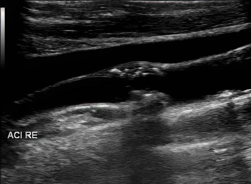Ultraschallaufnahme eines hirnzuführenden Gefäßes mit arteriosklerotischem Plaque.