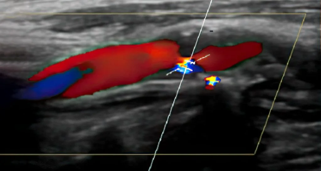 Farbduplex-Sonographie eines hirnzuführenden Gefäßes, eine Verengung ist gut sichtbar.
